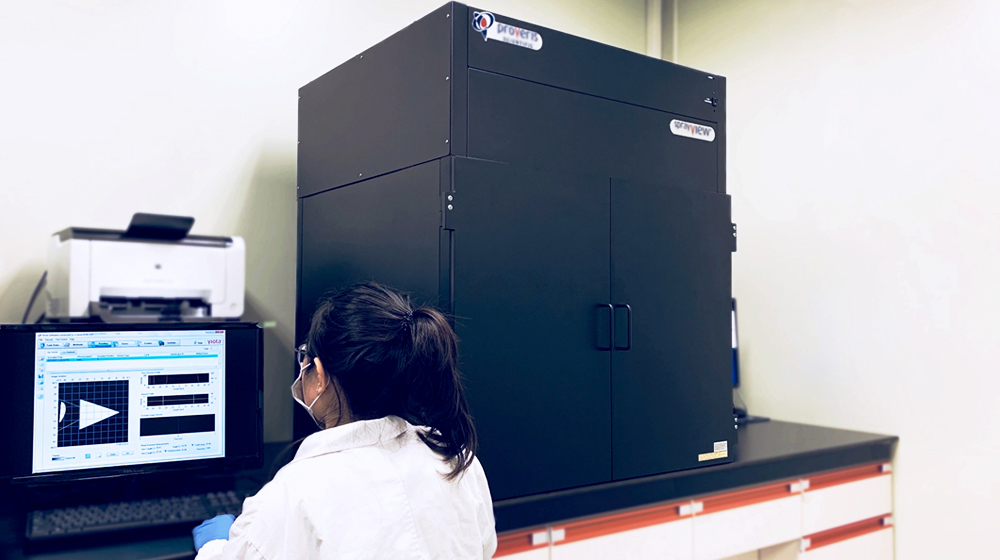 Spray patterns and plume geometry can be visualized using a system based on a laser light sheet and high-speed digital camera. The shape, angle and duration of plume is highly influential in the uniform delivery and bioavailability of product, and therefore product efficacy.