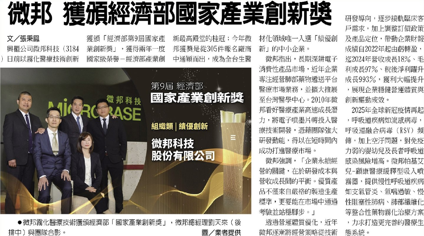 Image 1: MicroBase received the National Industrial Innovation Award from Taiwan's Ministry of Economic Affairs for its breakthrough in nebulization medical technology. As the only SME in Taiwan's biomedical and materials sectors to earn the“Outstanding Innovation”honor. (Source: MOEA National Industrial Innovation Award)
